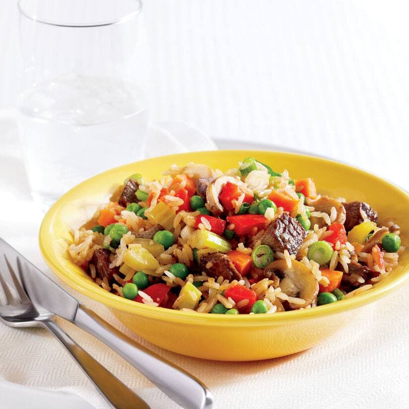 - Ajouter le riz, le bifteck, les petits pois, la sauce soja et la sauce aux huîtres et cuire, en brassant, pendant 3 minutes. Retirer le wok du feu. Ajouter la partie verte des oignons verts et l'huile de sésame et mélanger.