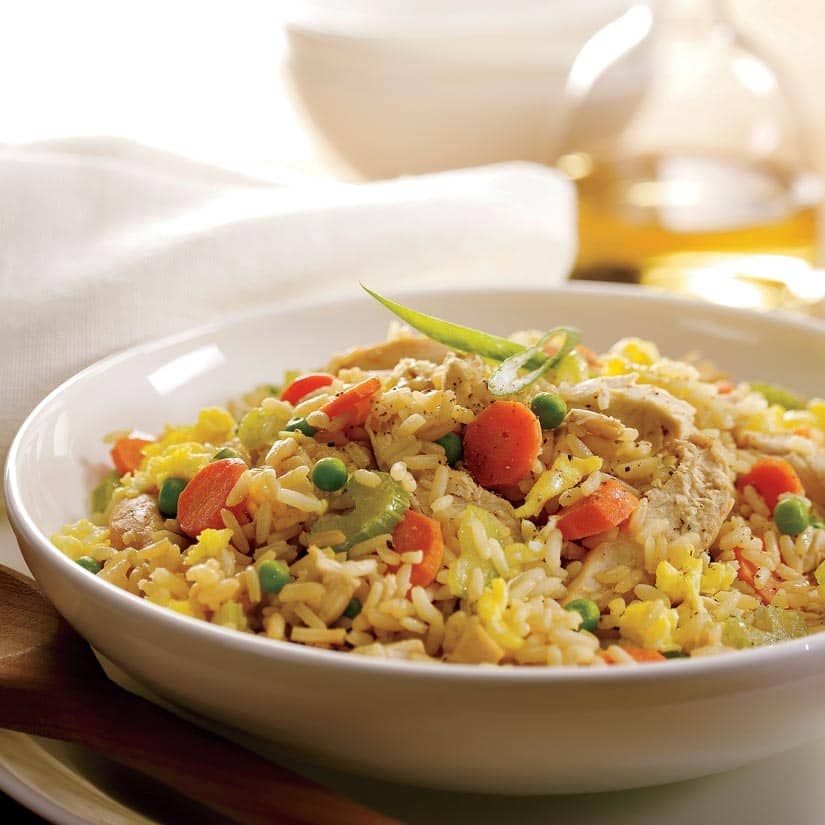 - Ajouter le riz, le poulet, les oignons verts, la sauce soja, le bouillon, les petits pois et les oeufs brouillés et cuire, en brassant, pendant 3 minutes ou jusqu'à ce que le liquide soit absorbé.