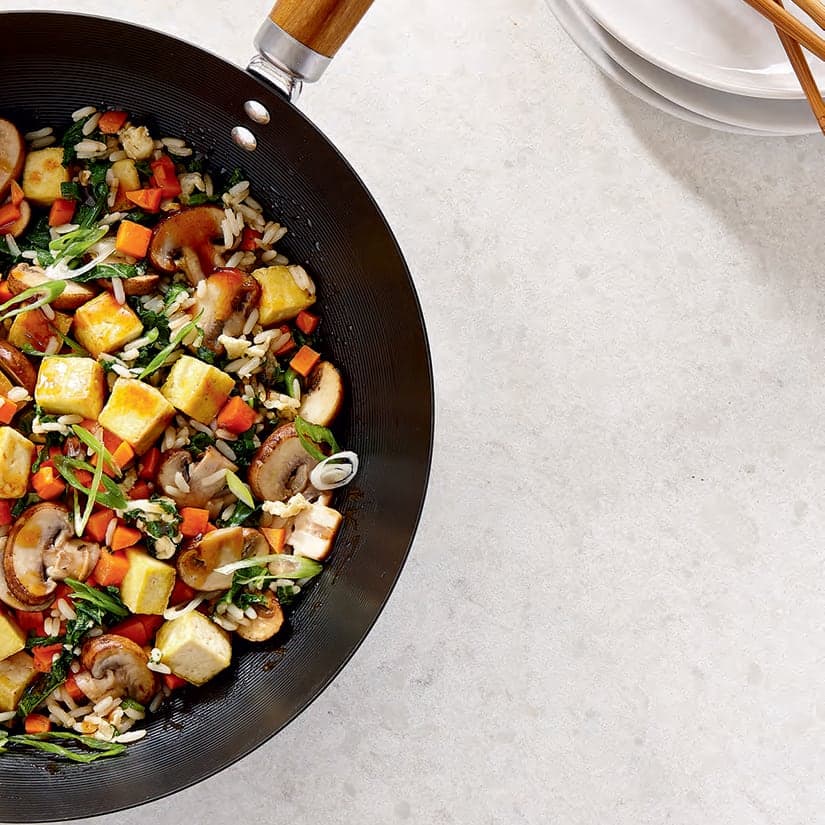 - Dans le wok, chauffer le reste de l'huile végétale à feu moyen-vif. Ajouter le tofu et cuire, en brassant, jusqu'à ce qu'il soit doré. Verser la sauce tamari et poursuivre la cuisson 30 secondes ou jusqu'à ce que le tofu soit bien enrobé. Ajouter le riz et cuire 5 minutes en brassant. Pousser le riz sur le pourtour du wok pour dégager le centre et y verser l'œuf et le blanc d'œuf. Cuire, en brassant, 2 minutes ou jusqu'à ce que les œufs soient cuits. Mélanger les œufs avec le riz.