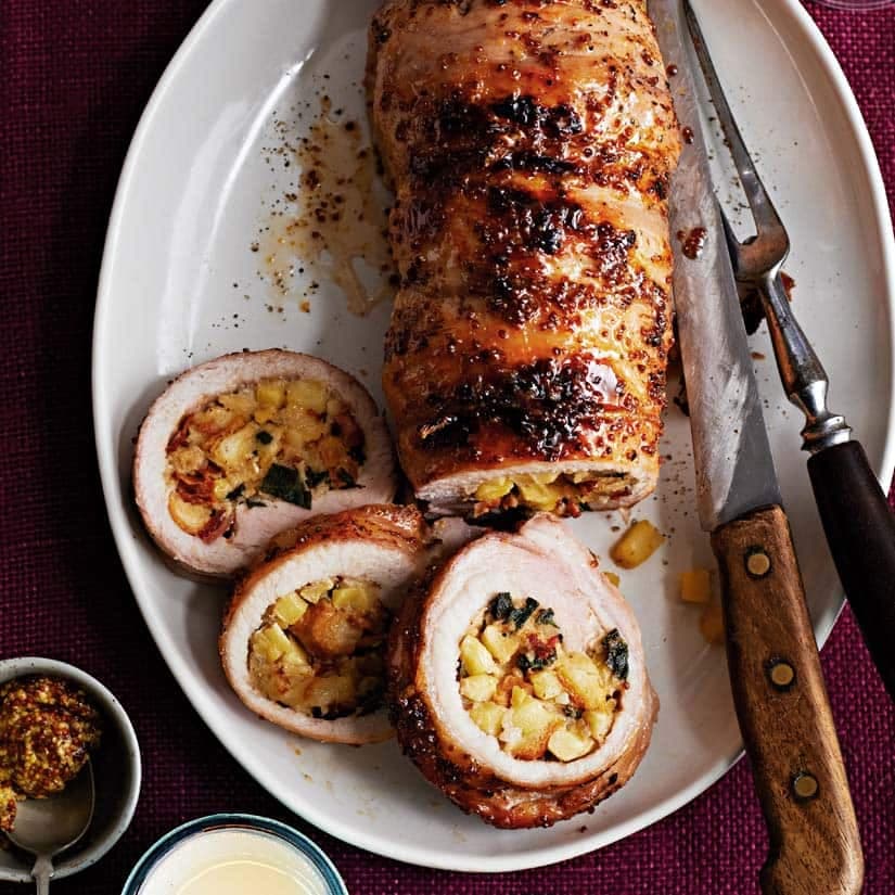 On veut réduire à 6 portions? Facile! Il suffit de remplacer le rôti de porc par 2 filets de porc (environ 12 oz/375 g chacun). On les coupe en deux dans le sens de la longueur jusqu’à ¼ po (5 mm) du bord, on les ouvre, puis on les aplatit à l’aide d’un maillet. On réduit les ingrédients de la farce de moitié, on la répartit sur chaque filet, en laissant une bordure d'environ 1 po (2,5 cm) sur le pourtour. On attache les filets à l'aide de ficelles à rôti, puis on enfourne en réduisant le temps de cuisson à environ 30 minutes.