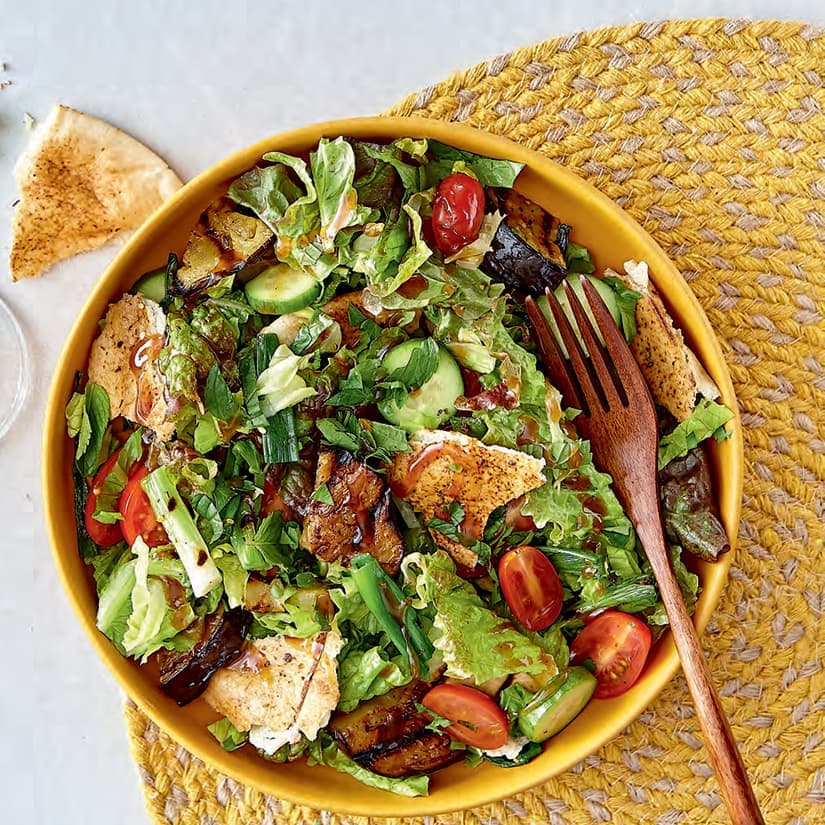 - Dans un grand bol, mettre les laitues, les concombres, les tomates raisins, l'aubergine, les oignons verts et les pitas grillés. Arroser de la moitié de la vinaigrette et mélanger délicatement. Saler et poivrer. Parsemer la salade de la menthe et du persil. Servir avec le reste de la vinaigrette.
