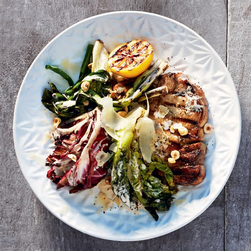 - Dans 4 assiettes, répartir les côtelettes de porc, le radicchio, la romaine, les oignons verts et les citrons. Arroser du reste de la sauce. Parsemer du parmesan et des noisettes.