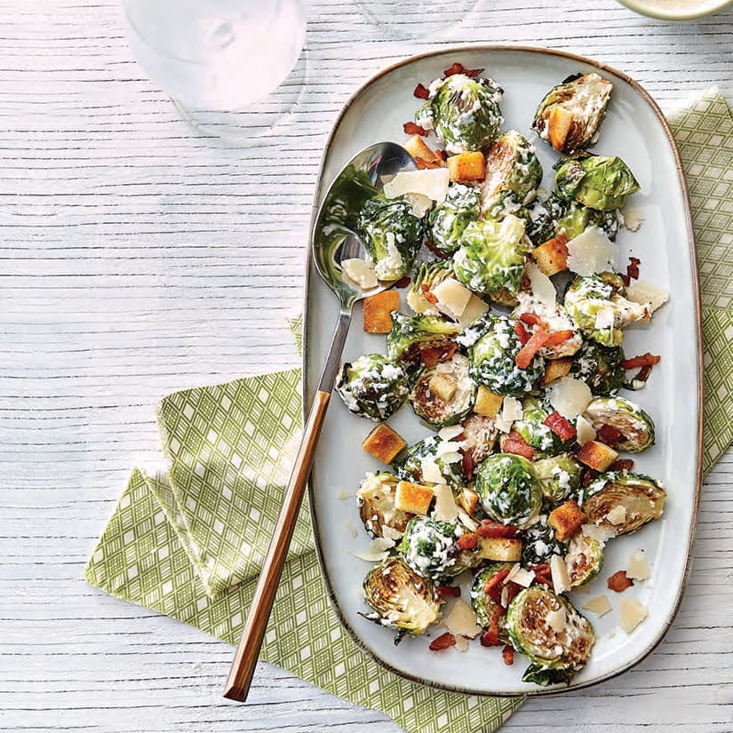 - Au moment de servir, mélanger les choux de Bruxelles rôtis avec suffisamment de la sauce crémeuse pour bien les enrober (réserver le reste de la sauce pour un autre usage). Mettre les choux dans une assiette de service et garnir du bacon réservé, du fromage et des croûtons.