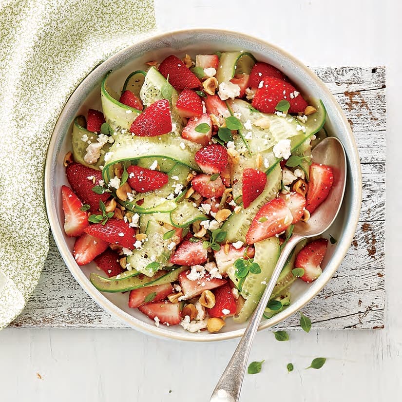 - Dans le bol, ajouter l'huile d'olive, les concombres et le féta. Saler, si désiré, et mélanger délicatement pour bien enrober les ingrédients. Parsemer des noisettes et du basilic.