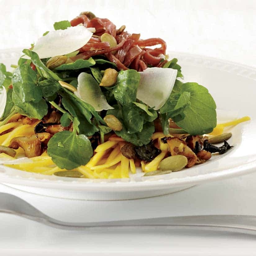 Salade de courge, cresson, champignons sauvages et canard fumé
