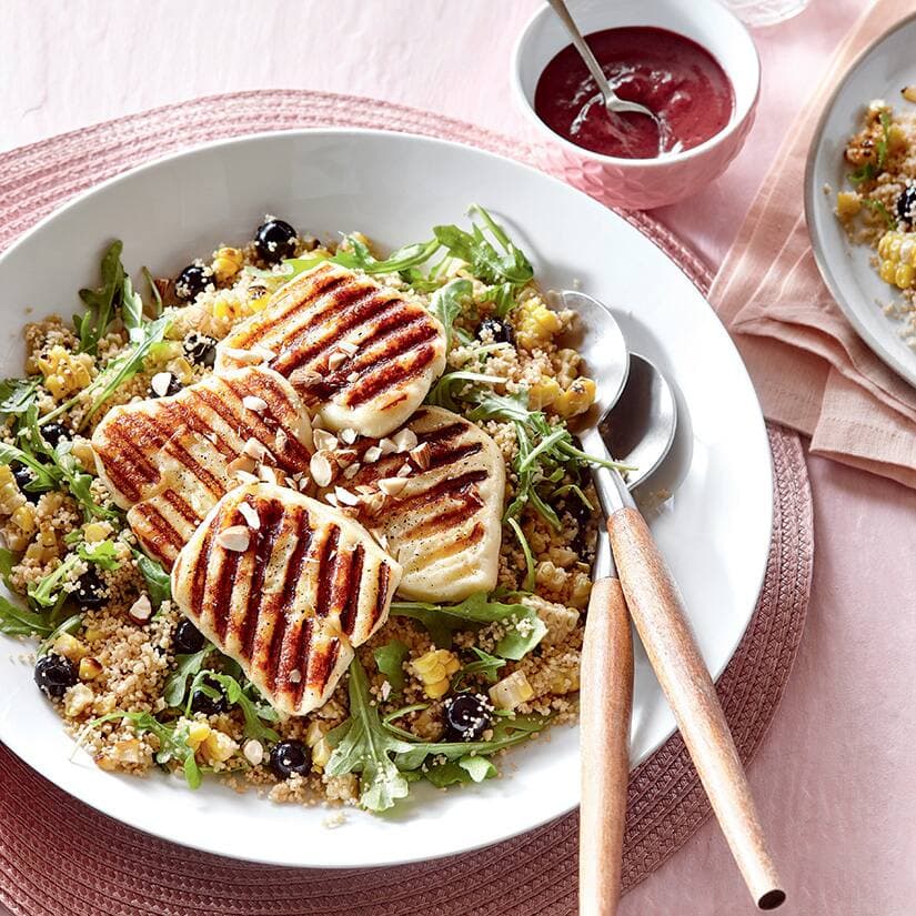 3. 3. Mélanger les grains de maïs, la roquette, les bleuets et les amandes avec le couscous. Garnir du fromage grillé et servir avec la vinaigrette (voir la recette).