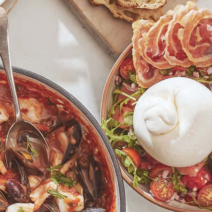 2. Dans un saladier, mélanger le melon, les tomates, la roquette, l'oignon et les herbes fraîches; arroser de la vinaigrette à l'orange. Déposer la burrata sur le dessus et répartir les tranches de pancetta sur la salade. Saler légèrement et poivrer. Garnir de feuilles de menthe et de basilic, si désiré. Déchiqueter la burrata juste avant de servir.