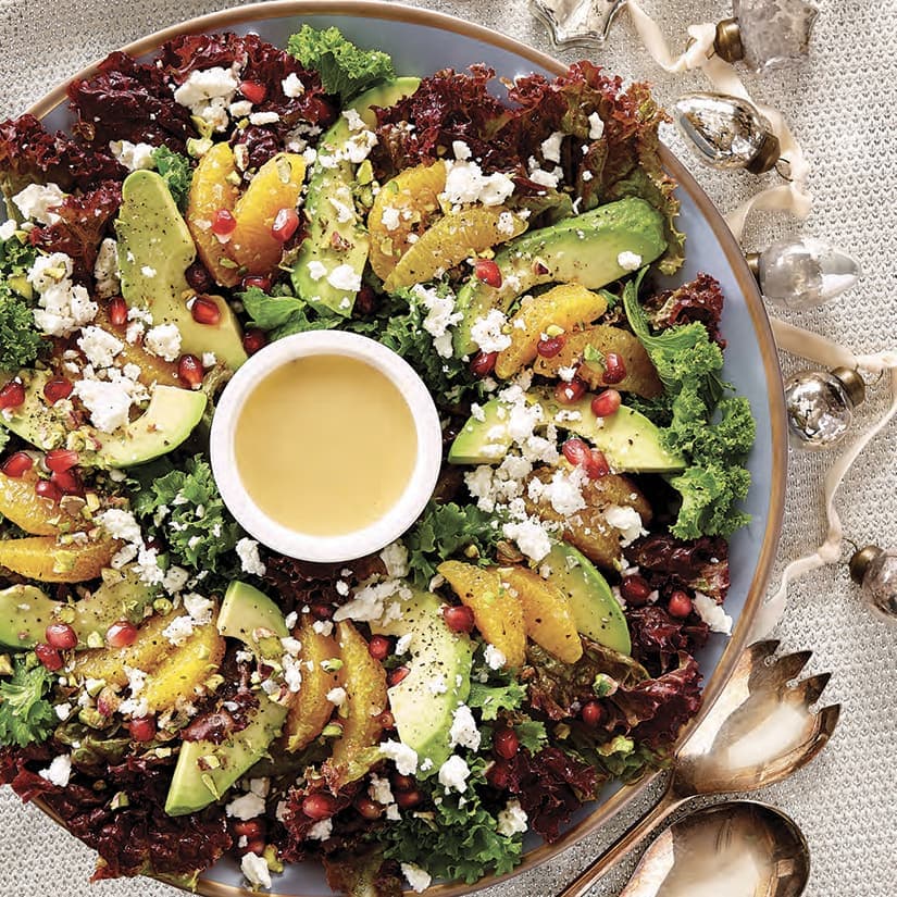 - Au centre d'une grande assiette de service, déposer un petit bol et y verser la vinaigrette. Disposer les feuilles de laitue dans le plat, autour du bol, de manière à former une couronne. Couvrir la laitue des suprêmes d'orange réservés en alternant avec les tranches d'avocat. Garnir la salade des arilles de grenade et des pistaches. Parsemer du fromage de manière à donner l'effet d'une fine neige. Saler et poivrer.
