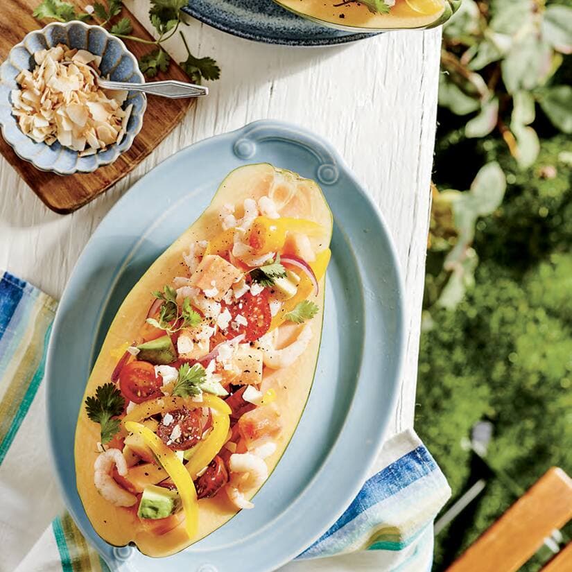 - Ajouter le reste des ingrédients dans le bol. Mélanger délicatement, puis saler et poivrer. Répartir dans les moitiés de papayes. Garnir de coriandre et de croustilles de noix de coco, si désiré.
