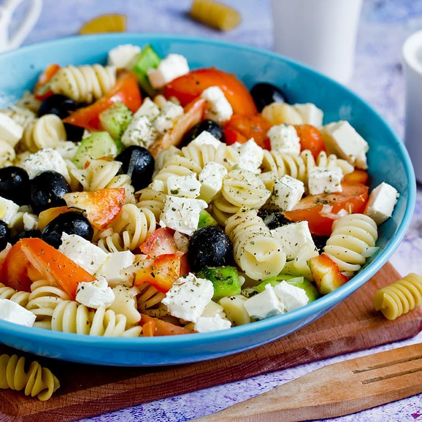 1. Dans une grande casserole d'eau bouillante salée, cuire les pâtes de 8 à 10 minutes ou jusqu'à ce qu'elles soient al dente. Égoutter et rincer à l'eau froide. Égoutter de nouveau et mettre les pâtes dans un grand bol. Ajouter le fromage feta, les tomates, le concombre anglais, les olives et l'origan.