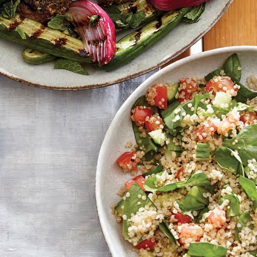 - Dans un grand bol, mélanger le quinoa, le concombre, la tomate, les épinards, l'huile d'olive et le jus du citron grillé. Saler et poivrer.