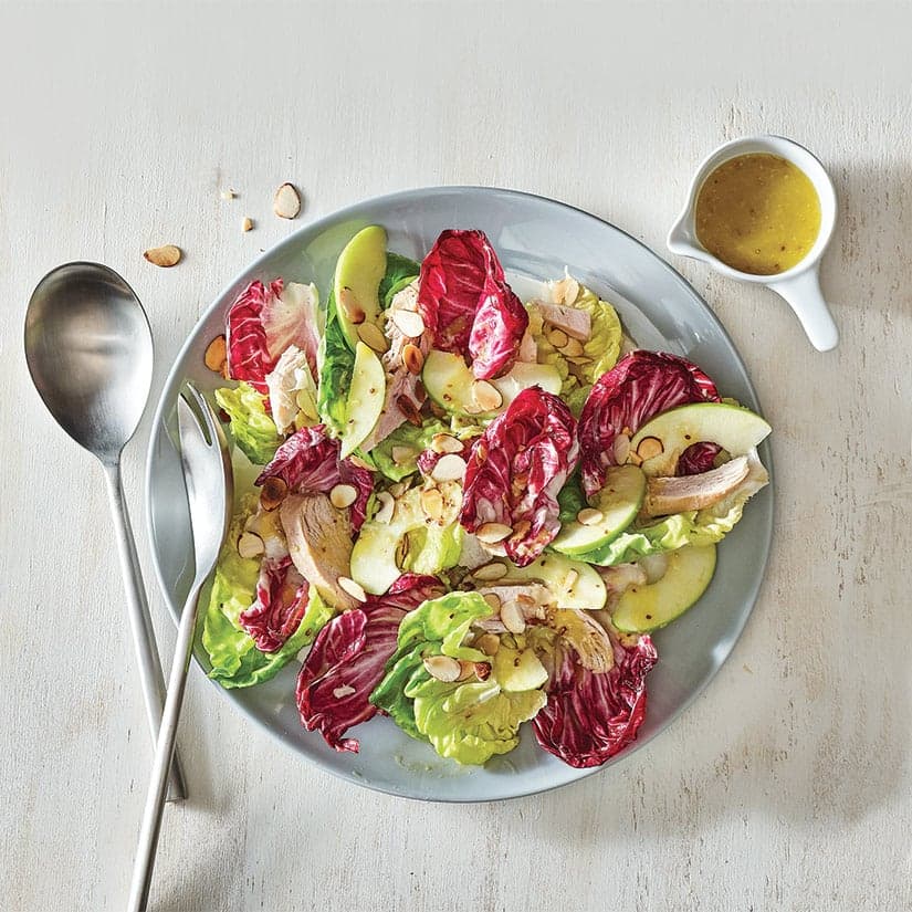 RecettesPlats principauxSalade radicchio, dinde et pommeSalade radicchio, dinde et pomme(0)Évaluer cette recetteQuantité4 portionsDurée totale15 min© Tango PhotographieCoup de Pouce2019-10-31T12:18:17ZPartagerPréparation15 minPublicitéIngrédients1 lb de dinde cuite, coupée en gros morceaux (environ 2 t /500 ml)6 tasses de feuilles de radicchios , rincées et égouttées2 tasses de feuilles de laitues Boston , rincées et égouttées1 grosse pomme à chair ferme, coupée en tranches fines1/4 tasse de vinaigrette , au choix (voir les recettes)1/4 tasse d' amande tranchéesPublicitéPréparationDans un grand bol, mélanger le radicchio, la laitue Boston, la dinde et la pomme. Arroser de vinaigrette (crémeuse ou au miel) et parsemer des amandes.PublicitéPublicité