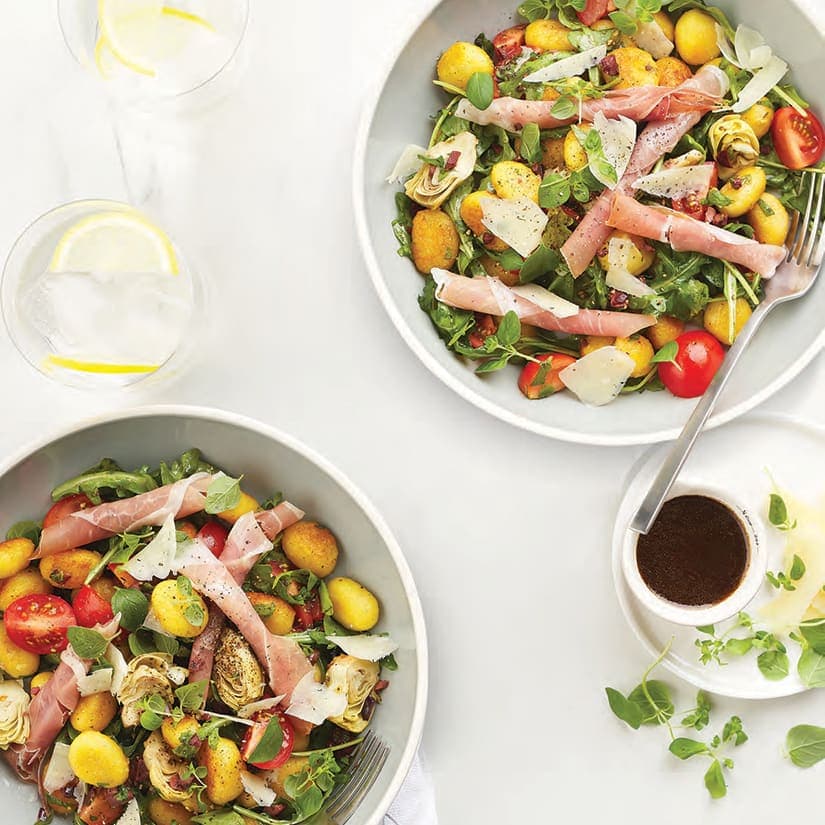 - Dans un grand bol, mélanger la roquette, les to- mates, les cœurs d'artichauts, les olives et la vinaigrette. Ajouter les gnocchis et mélanger pour bien les enrober. Répartir la salade dans des assiettes. Garnir des rouleaux de prosciutto réservés, des copeaux de parmesan et de l'origan.