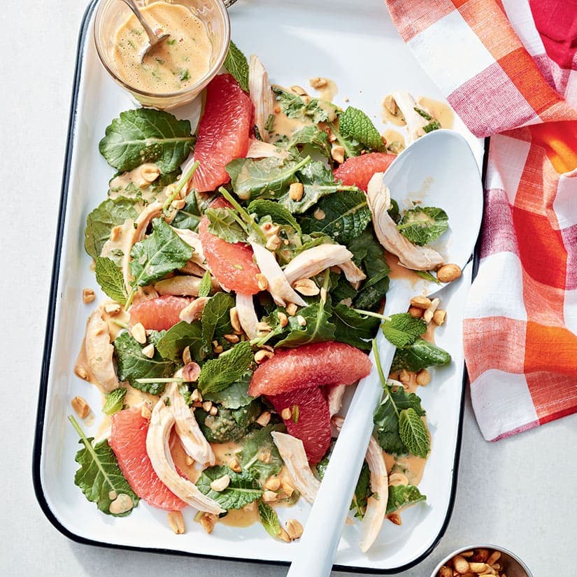 1. Dans un grand bol, mettre le poulet effiloché et le chou frisé. Arroser de la vinaigrette à la thaïe. Mélanger pour bien enrober les ingrédients. Mettre la salade dans un plat de service. Garnir des suprêmes de pamplemousse réservés, des arachides et de la menthe.