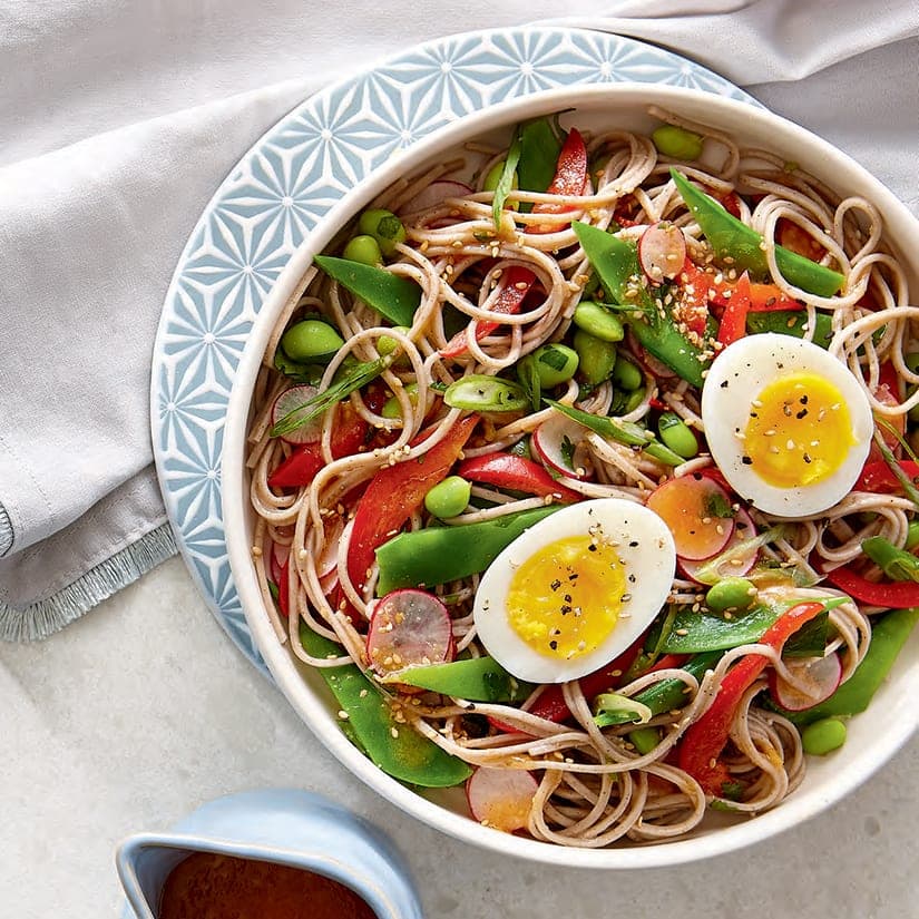 - Dans la casserole ayant servi à cuire les nouilles, blanchir 2 minutes les pois mange-tout et les édamames. Égoutter. Dans un grand bol, mélanger les légumes blanchis, le poivron, les radis, les oignons verts et la coriandre avec la moitié de la vinaigrette. Ajouter les nouilles réservées et le reste de la vinaigrette, et mélanger délicatement pour enrober les nouilles. Répartir la salade de nouilles dans 4 bols, garnir des œufs et parsemer des graines de sésame.
