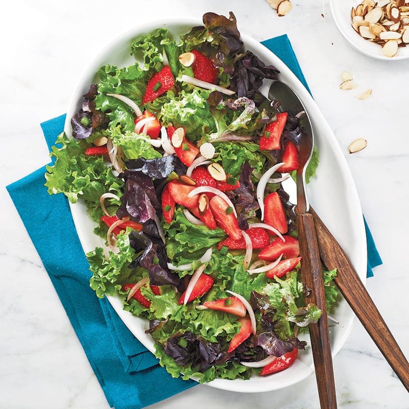 - Dans un grand bol, mélanger la laitue avec la vinaigrette pour bien l'enrober. Garnir de la salsa aux fraises et parsemer des amandes.