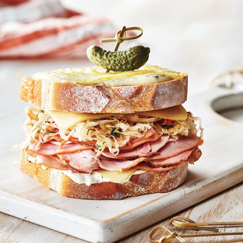 - Dans un bol, mélanger la mayonnaise avec la crème sure, la crème, l'ail, l'aneth, la ciboulette et le jus de citron. Badigeonner la moitié des tranches de pain de la moitié de la sauce ranch. Garnir chacune d'environ 4 tranches de jambon, de 1/4 t (60 ml) de choucroute et de 1 tranche de fromage. Couvrir du reste du pain, de la sauce et du fromage.