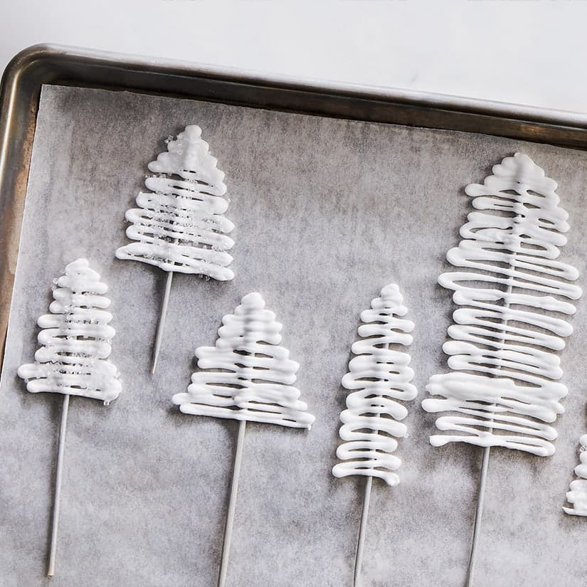 - Mettre la pâte dans une poche à douille munie d'un embout plat de 1/4 po (5 mm) (ou dans un sac en plastique coupé à un coin). Déposer de 8 à 10 brochettes en bois sur 2 plaques de cuisson recouvertes de papier parchemin en les espaçant de 2 po (5 cm). Faire un motif de sapin avec la pâte en zigzaguant sur les brochettes en bois avec la poche à douille. Couvrir de miniboules de sucre, si désiré. Laisser reposer de 6 à 8 h à la température ambiante.