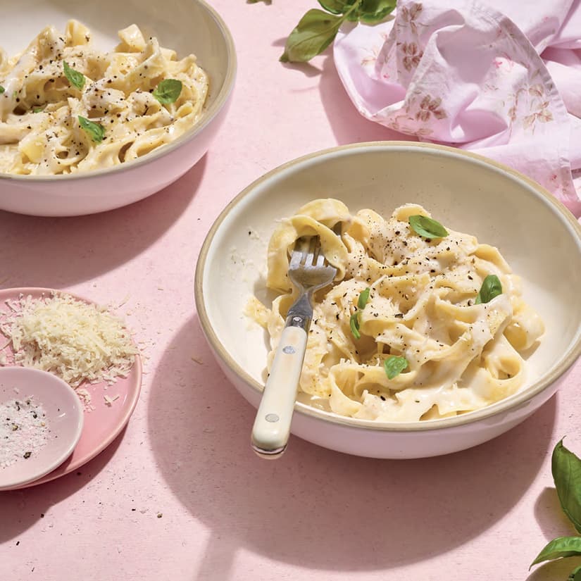 - Transvider dans une poêle à feu moyen- doux et laisser mijoter de 4 à 5 minutes (ou jusqu'à ce que la sauce bouillonne et soit légèrement épaissie), en remuant souvent au fouet. Servir sur les pâtes et garnir de parmesan et de fines herbes, si désiré.