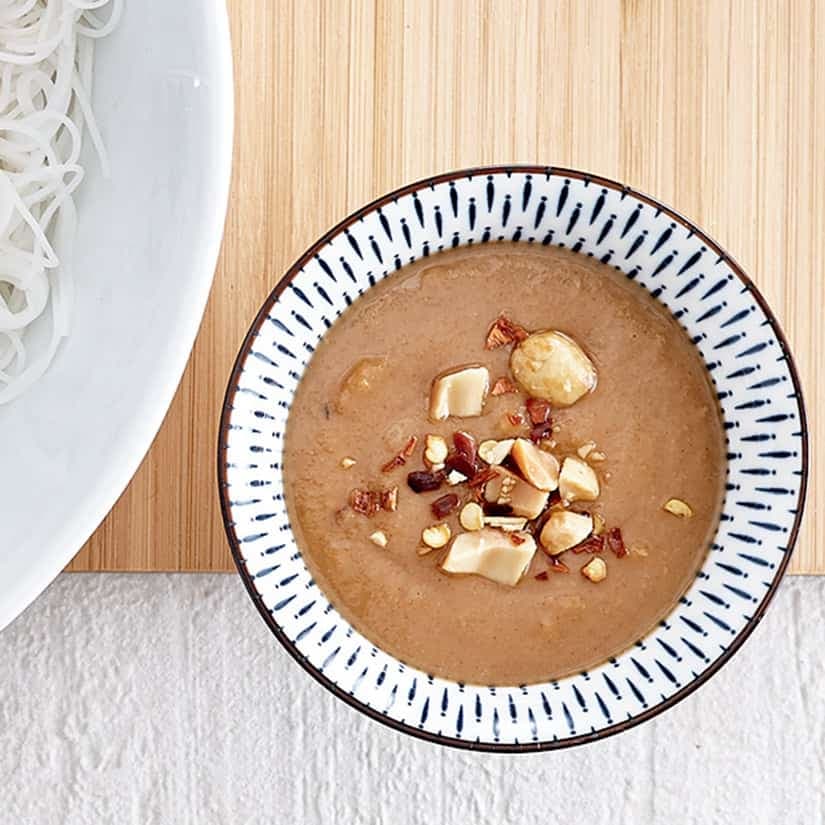 - Dans un bol, à l'aide d'un fouet, mélanger le beurre d'arachides, le lait de coco, la sauce soya, le vinaigre de riz, la cassonade, l'ail, le gingembre les flocons de piment fort. (La sauce se conservera jusqu'à 5 jours au réfrigérateur.)