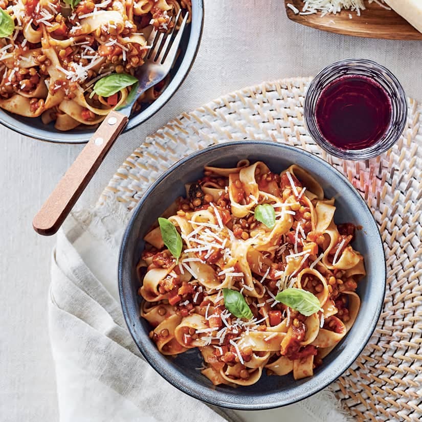- Servir la bolognaise de lentilles avec des pâtes riches en fibres. Garnir de basilic et de parmesan, si désiré.