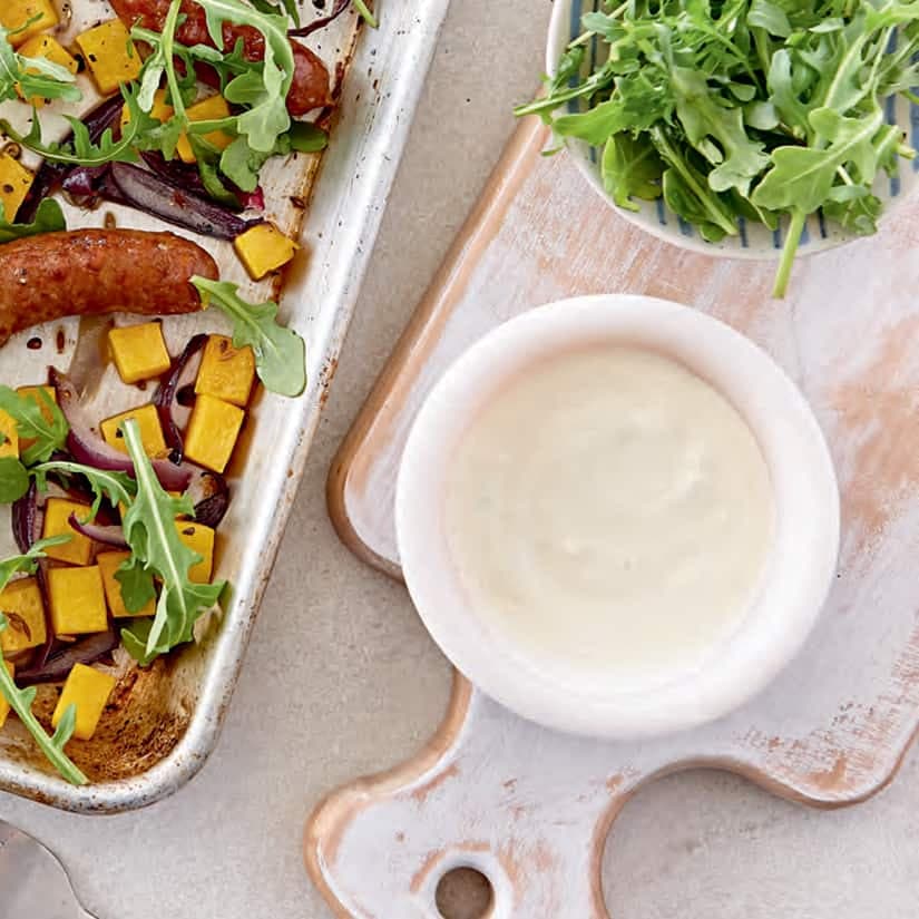 1. Dans un petit bol, mélanger le yogourt, la mayonnaise, l'huile d'olive et l'ail. Saler et poivrer. (La sauce à l'ail se conservera jusqu'à 3 jours au réfrigérateur.)