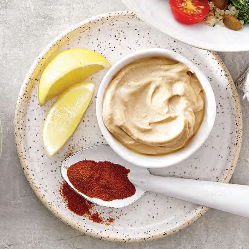 1. Au pied-mélangeur, bien mélanger la levure alimentaire, le tahini, la sauce tamari , le vinaigre de cidre, le jus de citron et l'ail. (La sauce se conservera jusqu'à 5 jours au réfrigérateur.)