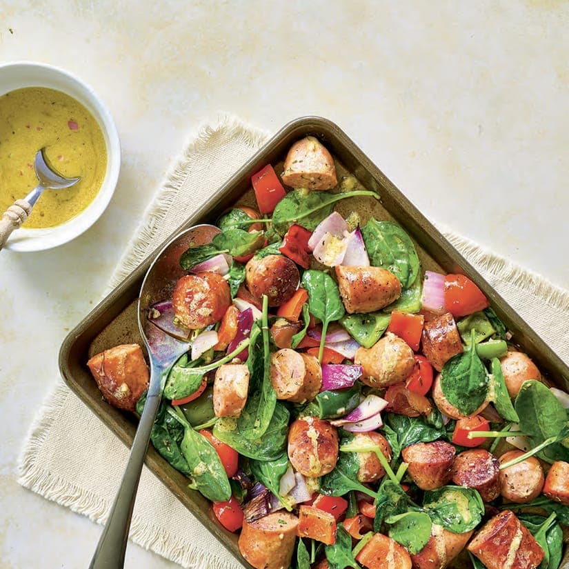 - Sur une plaque de cuisson, mélanger les saucisses, l'oignon, les poivrons, l'huile et les épices, incluant du sel et du poivre. Cuire de 13 à 15 minutes (ou jusqu'à l'obtention d'une belle coloration), en remuant à quelques reprises. Ajouter les épinards ainsi que la vinaigrette, au goût. Mélanger délicatement et servir sur du couscous.