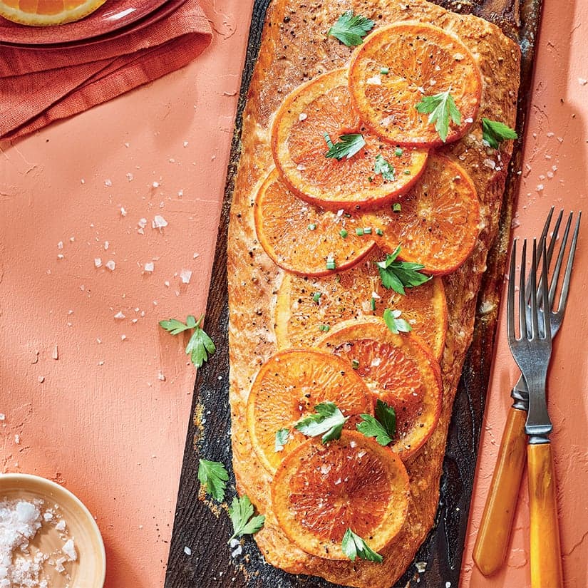 - Régler le barbecue à puissance moyenne-élevée. Mettre une planche de bois préalablement trempée dans l'eau sur la grille du barbecue, fermer le couvercle et la chauffer de 3 à 4 minutes ou jusqu'à ce qu'elle crépite et fume légèrement. À l'aide d'une grande spatule, déposer délicatement le filet de saumon sur la planche. Couvrir le saumon des tranches d'orange. Fermer le couvercle et cuire de 25 à 30 minutes ou jusqu'à ce que la chair du poisson se défasse facilement à la fourchette (au besoin, vaporiser la planche d'eau si elle prend feu.)