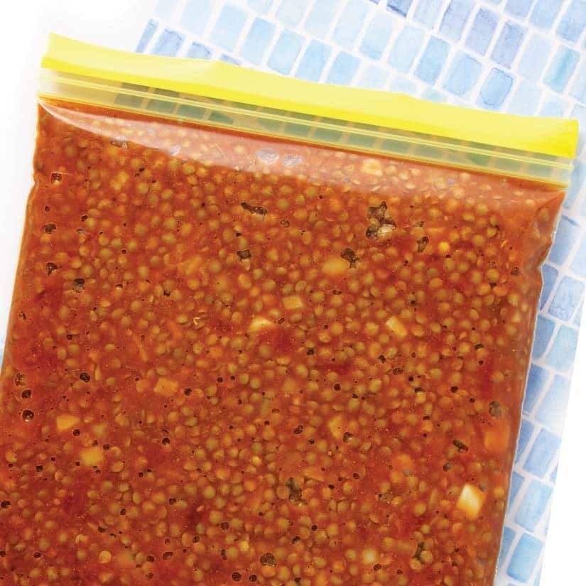 - Dans un sac de congélation, mettre les lentilles, l'oignon, les tomates, l'ail, le gingembre, le cari, le cumin, la coriandre et le curcuma. Saler et poivrer. Fermer le sac hermétiquement et mélanger délicatement. Déposer à plat au congélateur. (Le mélange se conservera jusqu'à 6 mois au congélateur.)