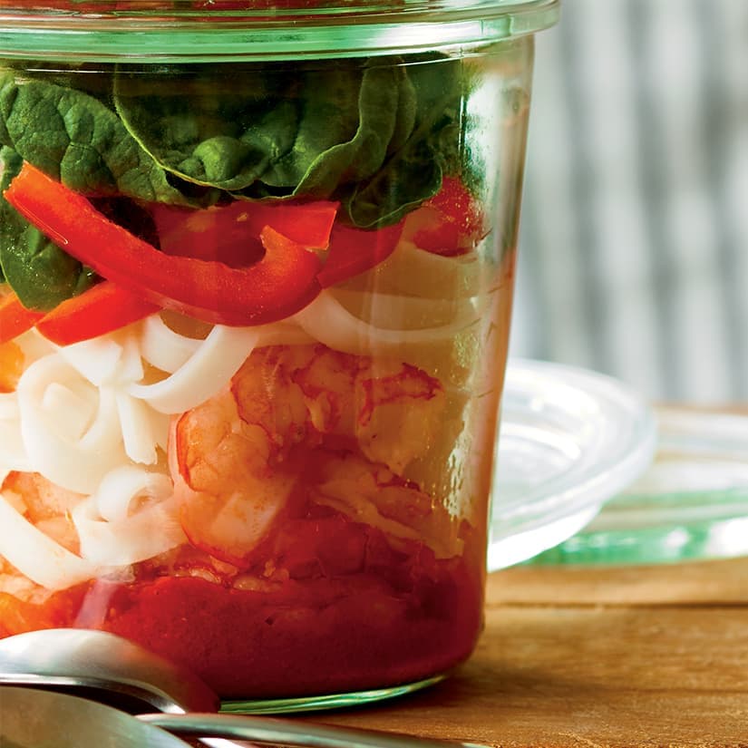 - Dans le fond d'un pot d'une capacité de 2 t (500 ml), mettre la pâte de cari. Ajouter le jus de lime, la sauce de poisson, le sambal oelek, le lait de coco, les crevettes, les nouilles, les épinards et le poivron. (Le pot de soupe instantanée se conservera jusqu'à 3 jours au réfrigérateur.)