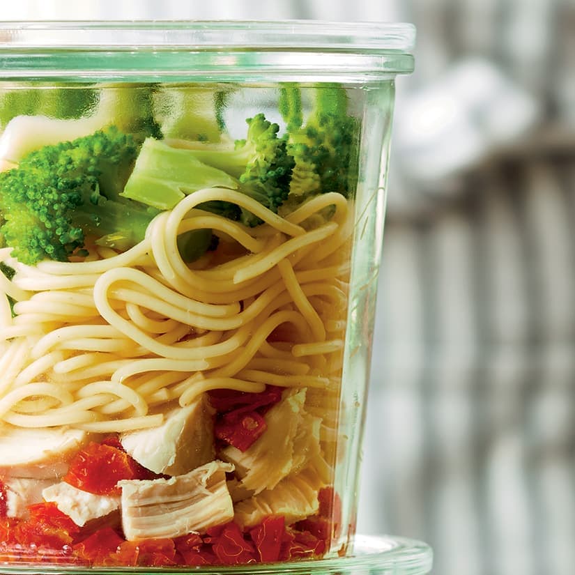 - Dans le fond d'un pot d'une capacité de 2 t (500 ml), mettre le concentré de bouillon. Ajouter le zeste et le jus de citron, les tomates séchées, le poulet, les spaghettinis et le brocoli. (Le pot de soupe instantanée se conservera jusqu'à 3 jours au réfrigérateur.)