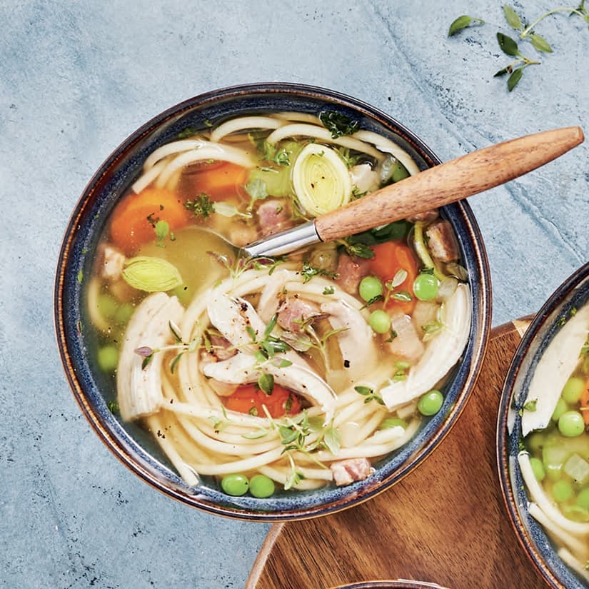 - Ajouter le bouillon et porter à ébullition, puis réduire le feu à moyen et cuire de 6 minutes, en remuant à l'occasion. Ajouter les pâtes, mélanger et cuire de 8 minutes (ou jusqu'à ce qu'elles soient al dente et que les légumes soient tendres). Ajouter le poireau, les épinards et les petits pois. Saler et poivrer, mélanger et cuire 2 minutes. Servir dans des bols avec le poulet sur le dessus, garni de pancetta et d'herbes fraîches, si désiré. Servir avec des pitas grillés, si désiré. (La soupe se conservera 3 jours au réfrigérateur ou 3 mois au congélateur).