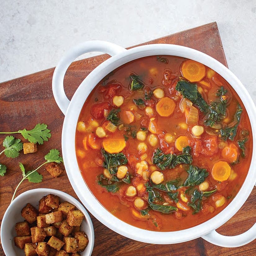 1. Répartir la soupe chaude dans des bols. Arroser du jus de citron, garnir des croûtons de tofu et parsemer de coriandre hachée.