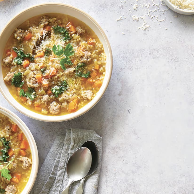 - Ajouter les boulettes et les pâtes, mélanger et poursuivre la cuisson à découvert. Laisser cuire de 5 à 7 minutes, jusqu'à ce que les boulettes soient réchauffées et que les pâtes soient cuites. Si désiré, défaire les boulettes à l'aide d'une cuillère de bois, pour former de plus petites bouchées. Éteindre le feu et ajouter le kale. Saler et poivrer, puis mélanger. Servir dans des bols et garnir avec du parmesan râpé et des herbes fraîches.