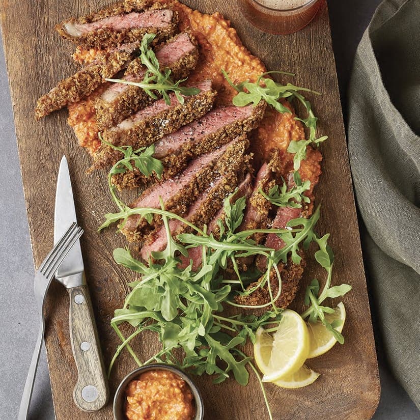 - Laisser reposer le steak 5 minutes sur une grille, afin de garder l'extérieur croustillant. Trancher dans le sens contraire des fibres de la viande. Servir la sauce romesco dans le fond des assiettes; répartir les tranches de steak par-dessus. Garnir avec des feuilles de roquette et arroser de jus de citron.