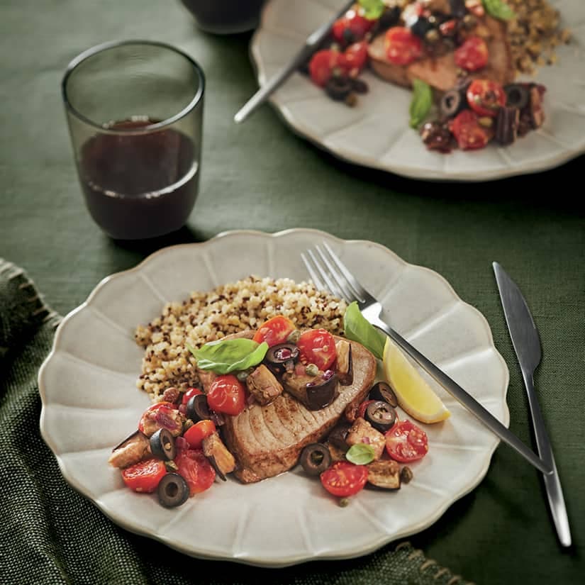 - Dans une poêle à feu moyen-élevé, chauffer l'huile d'olive, puis saisir les steaks de thon 2 à 3 minutes de chaque côté. Assaisonner de sel de mer et de poivre du moulin. Servir sur du quinoa, avec la caponata, des quartiers de citron et du basilic frais, si désiré. (La caponata se conservera 5 jours au réfrigérateur. On peut aussi la déguster sur des tranches de baguette, sur du poulet ou avec des pâtes.)