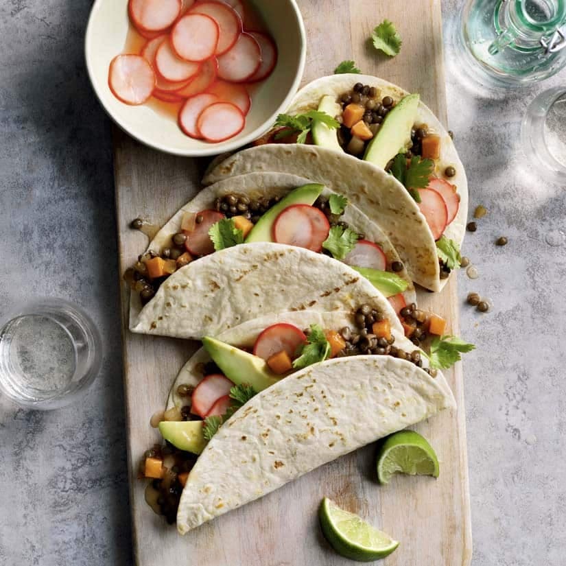 3. Au moment de servir, mettre environ 1/4 t (60 ml) de la garniture à la patate douce sur chaque tortilla. Garnir des radis marinés et de l'avocat.