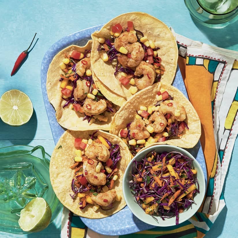 - Servir dans des tortillas réchauffées, avec la salade de chou à la mangue, du piment chili, des tomates et du maïs pour garnir.