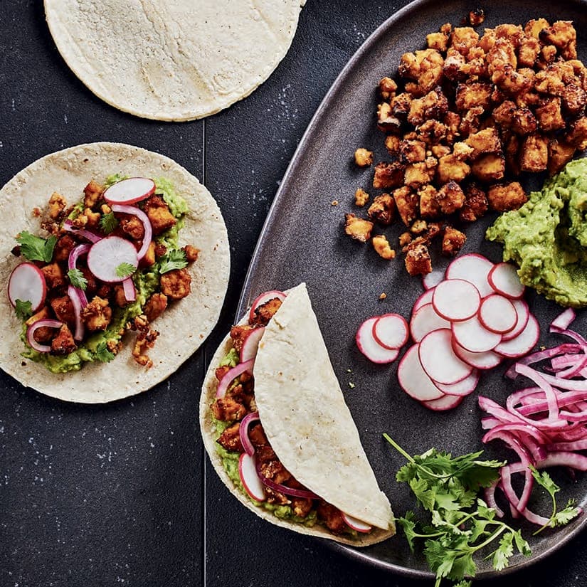 - Assembler les tacos en garnissant les tortillas avec le tofu, le guacamole, les radis, les feuilles de coriandre, puis arroser d'un peu de sauce. Compléter avec des oignons marinés, si désiré.