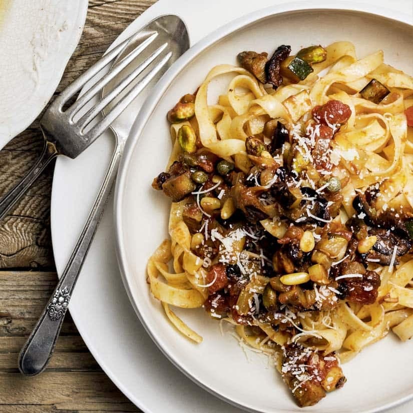 - Incorporer les tomates broyées et l'aubergine réservée, saler, poivrer et porter à ébullition. Réduire le feu et laisser mijoter pendant 3 minutes. Arroser du vinaigre et incorporer le sucre. Ajouter les pâtes cuites à la préparation. Ajouter un peu d'eau de cuisson, si nécessaire. Garnir chaque portion de parmesan.