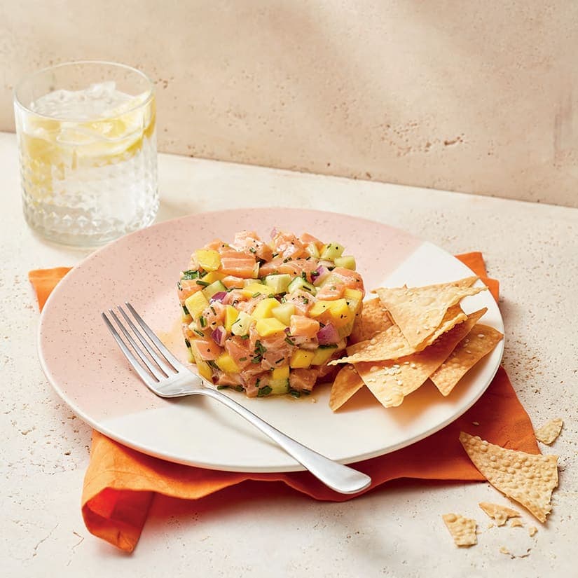 - À l'aide d'un emporte-pièce rond ou d'un ramequin, répartir délicatement le tartare de saumon dans quatre petites assiettes. Servir aussitôt avec des croustilles de wonton ou des croûtons, si désiré.