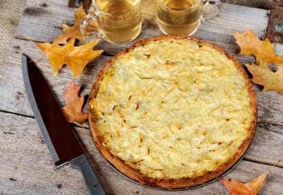 - Ajouter l'oeuf, la crème sure et l'oignon vert à la préparation aux oignons refroidie et bien mélanger. Étendre uniformément la préparation aux oignons sur la pâte à pizza en laissant la bordure intacte. Cuire au four préchauffé à 350°F (180°C) pendant environ 30 minutes ou jusqu'à ce que la croûte soit dorée et que le centre de la garniture ait pris. (Vous pouvez préparer la tarte à l'oignon à l'avance et la couvrir de papier d'aluminium, sans serrer. Elle se conservera jusqu'à 1 heure à la température ambiante.) Au moment de servir, à l'aide d'un couteau bien aiguisé, couper la tarte en pointes.