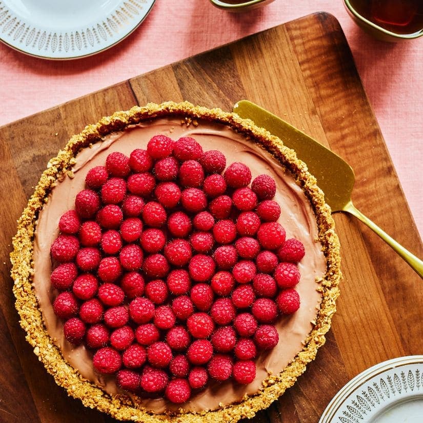 - Verser la ganache au chocolat dans la croûte refroidie. Garnir de framboises et réfrigérer au moins 1 heure, jusqu'à ce que la ganache soit figée. Servir.