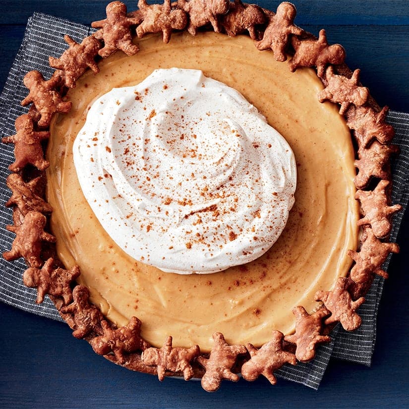 - Dans un bol, à l'aide du batteur électrique, fouetter la crème jusqu'à ce qu'elle forme des pics mous. Incorporer le sucre et la vanille en battant. À l'aide d'une cuillère, couvrir la tarte de la crème fouettée, en laissant une bordure de 2 po (5 cm). Parsemer de la cannelle et garnir de bonhommes en pain d'épice, si désiré.