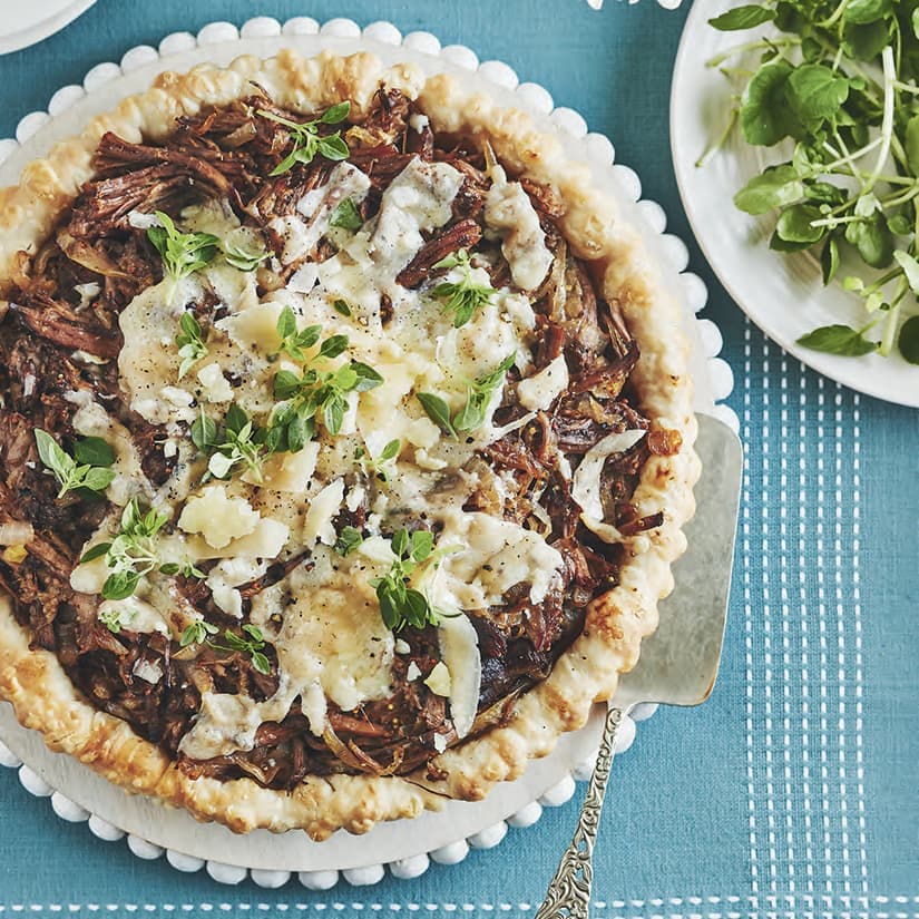 - Verser le mélange de viande dans le fond de tarte. Couvrir de copeaux de fromage et cuire au centre du four de 7 à 10 minutes ou jusqu'à ce que la tarte soit réchauffée et le fromage, fondu. Garnir d'origan frais et servir avec la salade de cresson.
