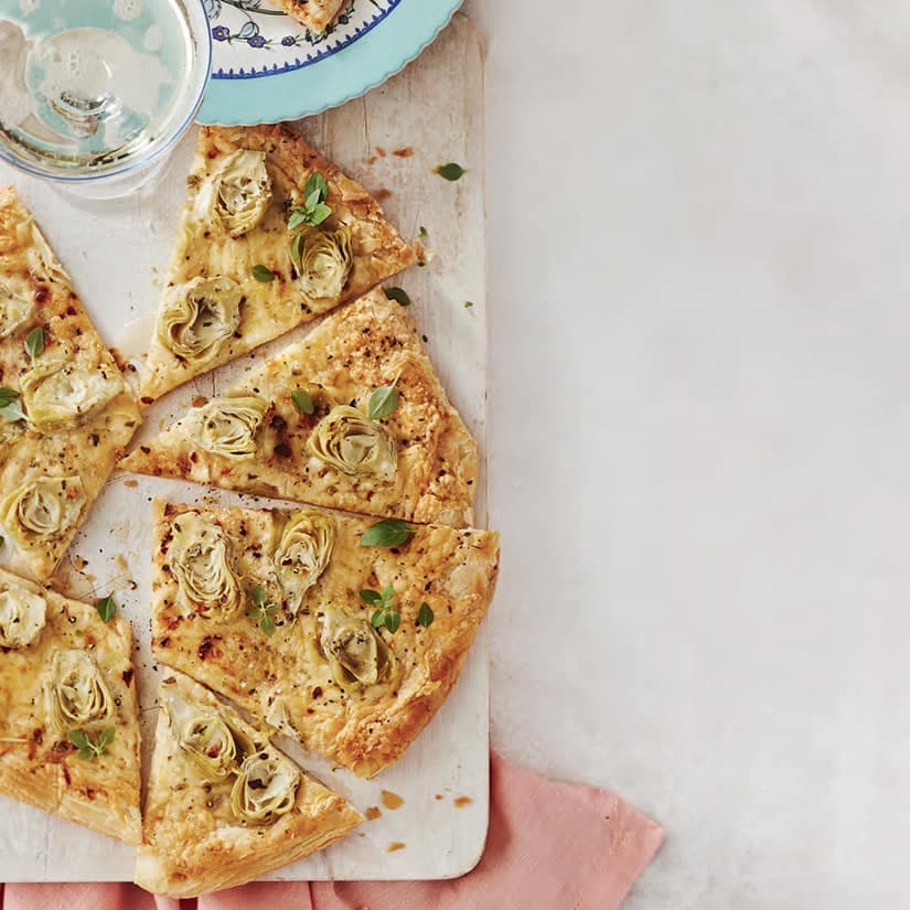 - Répartir le gouda et le parmesan sur la pâte, puis verser la crème sur le fromage. Parsemer du thym, ainsi que des flocons de piment. Déposer les demi-artichauts sur le fromage. Verser le miel en filet, puis saler et poivrer.