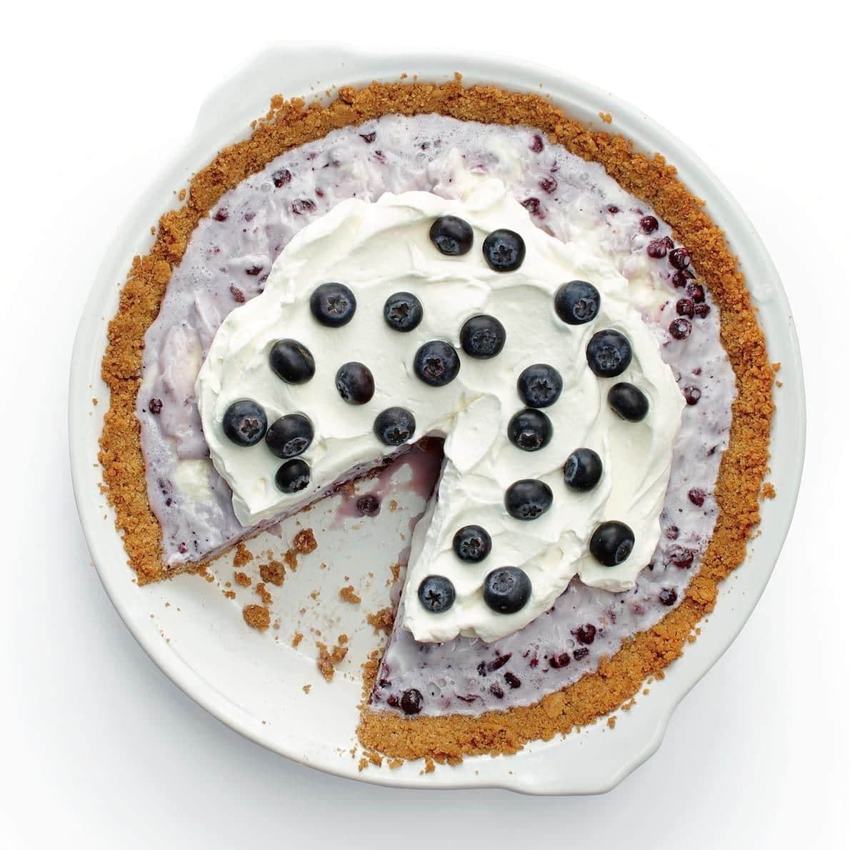 - Dans un bol, mélanger le yogourt glacé à la vanille ramolli avec la préparation de bleuets. Étendre la garniture aux bleuets dans la croûte aux gaufrettes Graham. Congeler au moins 2 heures.