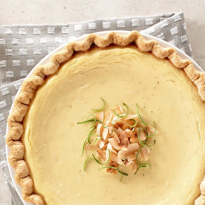 - Cuire au four préchauffé à 350°F (180°C) pendant 1 heure ou jusqu'à ce que le bord de la tarte ait pris mais que le centre soit encore légèrement gélatineux. Déposer l'assiette à tarte sur une grille et laisser refroidir. Réfrigérer pendant 4 heures ou jusqu'à ce que la tarte soit ferme. Au moment de servir, garnir la tarte de copeaux de noix de coco grillée et de zeste de lime.