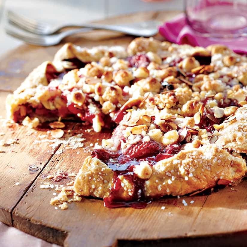 - Sur une grande feuille de papier parchemin, abaisser la pâte en un cercle de 17 po (43 cm) de diamètre. Glisser le papier avec l'abaisse sur une grande plaque de cuisson et parsemer des amandes moulues, en laissant une bordure intacte de 3 po (8 cm) sur le pourtour. Étendre la garniture aux fraises réservée sur l'abaisse. Rabattre la bordure de pâte sur la garniture, de manière à obtenir une tarte d'environ 12 po (30 cm) de diamètre. Couper l'excédent de papier parchemin et parsemer la garniture aux fraises de la garniture streusel réservée.